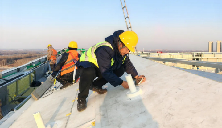 東北的冬季是最大考驗。三新專項技術(shù)組優(yōu)化圍護工藝,攻克低溫TPO 焊接難題;排水天溝內(nèi)置精準(zhǔn)電伴熱系統(tǒng),杜絕凍堵風(fēng)險;光伏支架立桿采用高分子包封件,實現(xiàn)防水與發(fā)電的無縫銜接。當(dāng)抗風(fēng)揭試驗室的模擬狂風(fēng)掠過屋面,這頂 “鳳冠” 用數(shù)據(jù)證明:它不僅是建筑的外衣,更是自然的摯友。