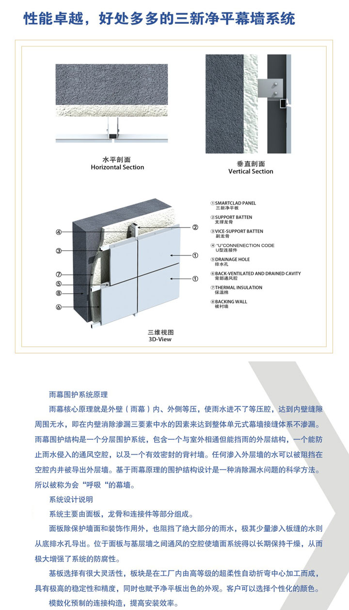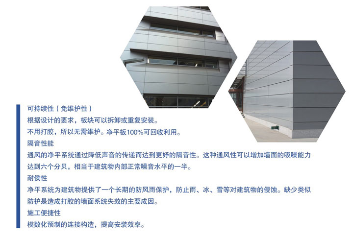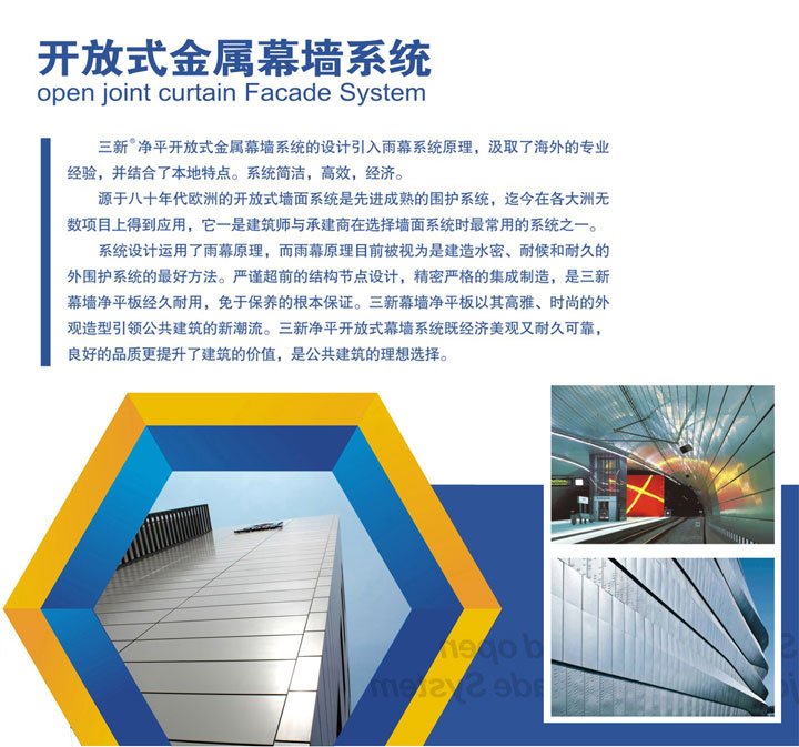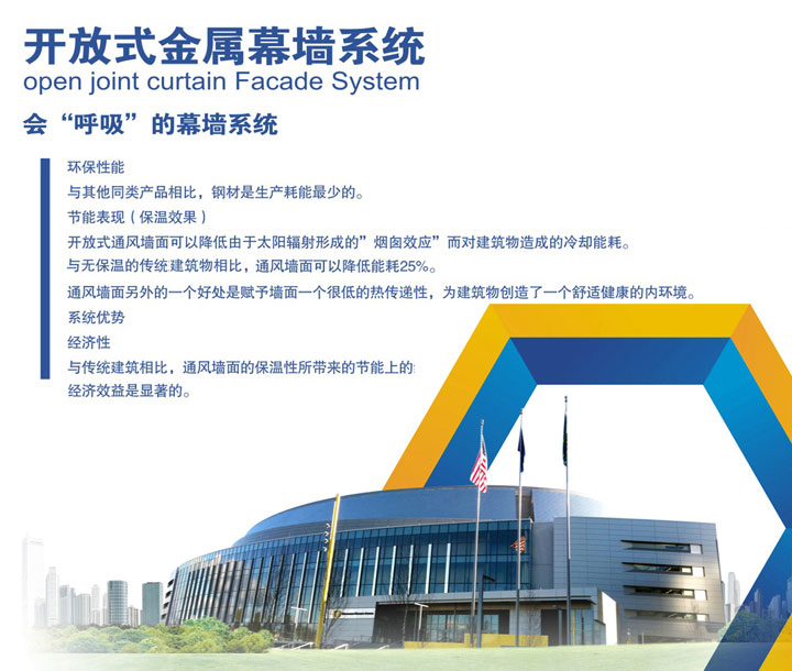 • 凈平開放式金屬幕墻系統(tǒng)----模數(shù)化的預制構(gòu)造,使安裝更便捷,效率更高。