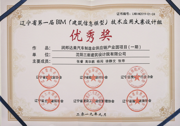 2019年10月18日,“遼寧省第一屆BIM(建筑信息模型)技術(shù)應(yīng)用大賽”召開了頒獎大會,頒發(fā)獎牌及榮譽(yù)證書。我公司由張睿、高華鵬、楊闖、徐敬文、張帝組成的BIM團(tuán)隊(duì)提交的參賽項(xiàng)目《潤邦達(dá)美汽車制造業(yè)供應(yīng)鏈產(chǎn)業(yè)園項(xiàng)目(一期)》斬獲遼大賽優(yōu)秀獎。