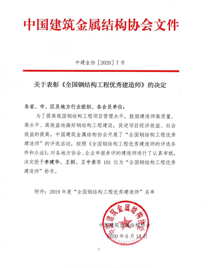 2020年6月15日,中國建筑金屬結(jié)構(gòu)協(xié)會(huì)組織的“全國鋼結(jié)構(gòu)工程優(yōu)秀建造師”評(píng)選活動(dòng)結(jié)果揭曉,李建華、王恒、王中錄等101位被評(píng)為“全國鋼結(jié)構(gòu)工程優(yōu)秀建造師”稱號(hào)。我公司李青山位列其中。李青山主持施工的“黃帝問道大型城雕項(xiàng)目”榮獲“中國鋼結(jié)構(gòu)金獎(jiǎng)”工程。