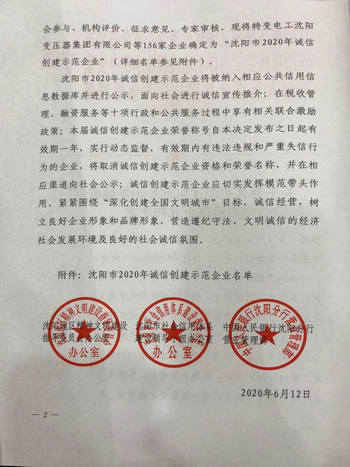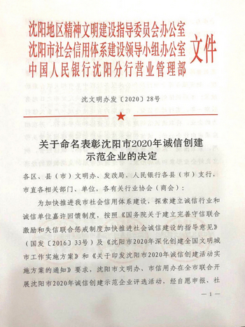 我公司榮獲“沈陽(yáng)市2020年誠(chéng)信創(chuàng)建示范企業(yè)”稱號(hào)