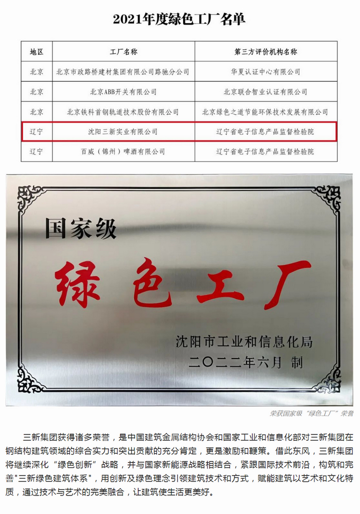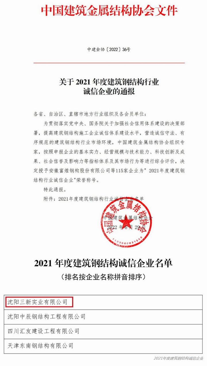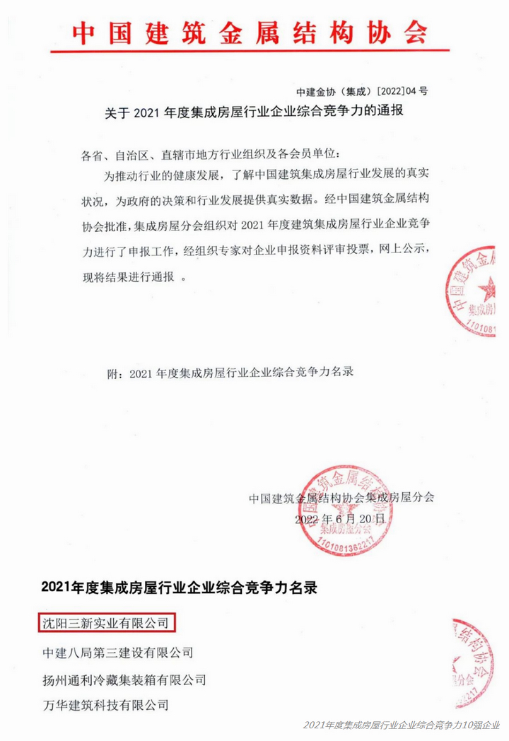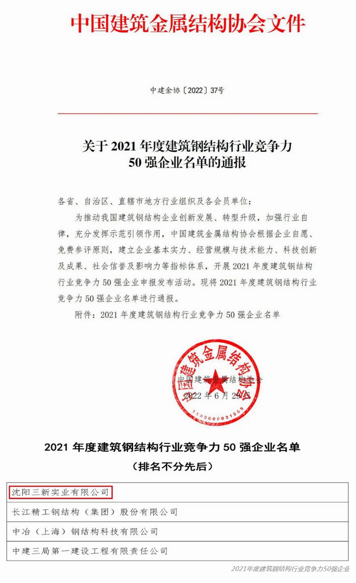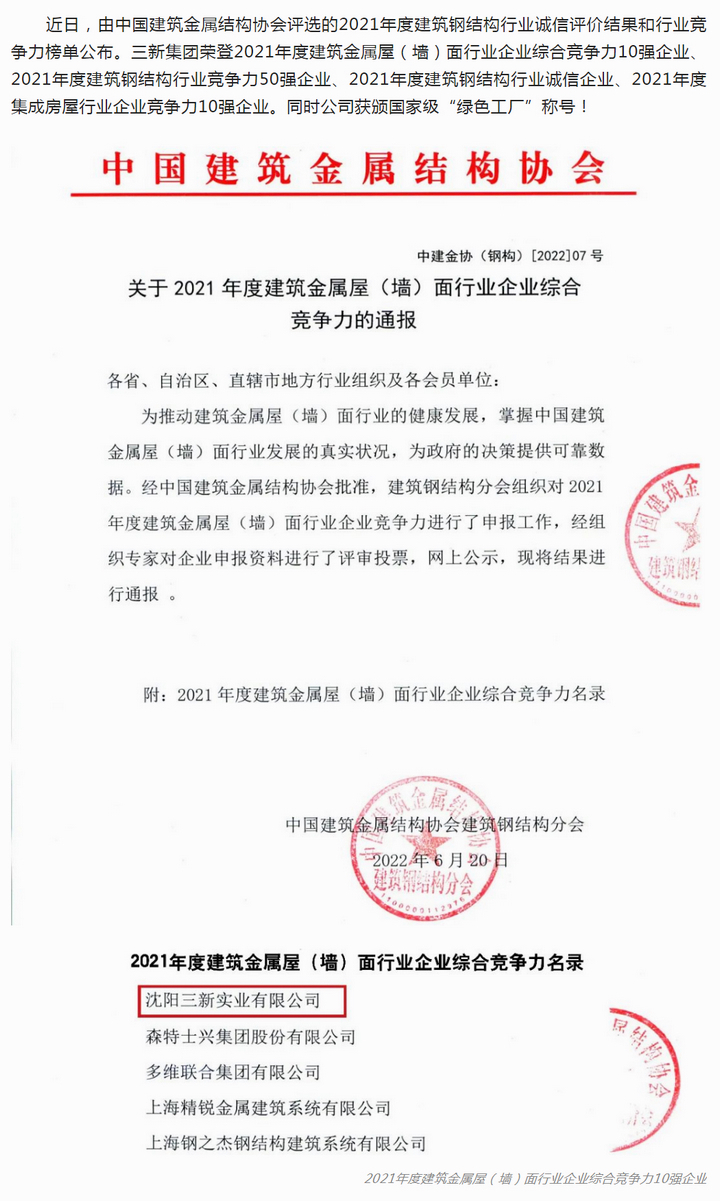 熱烈祝賀三新集團榮獲“2021年度建筑金屬屋(墻)面行業(yè)企業(yè)綜合競爭力10強企業(yè)”等多項殊榮!