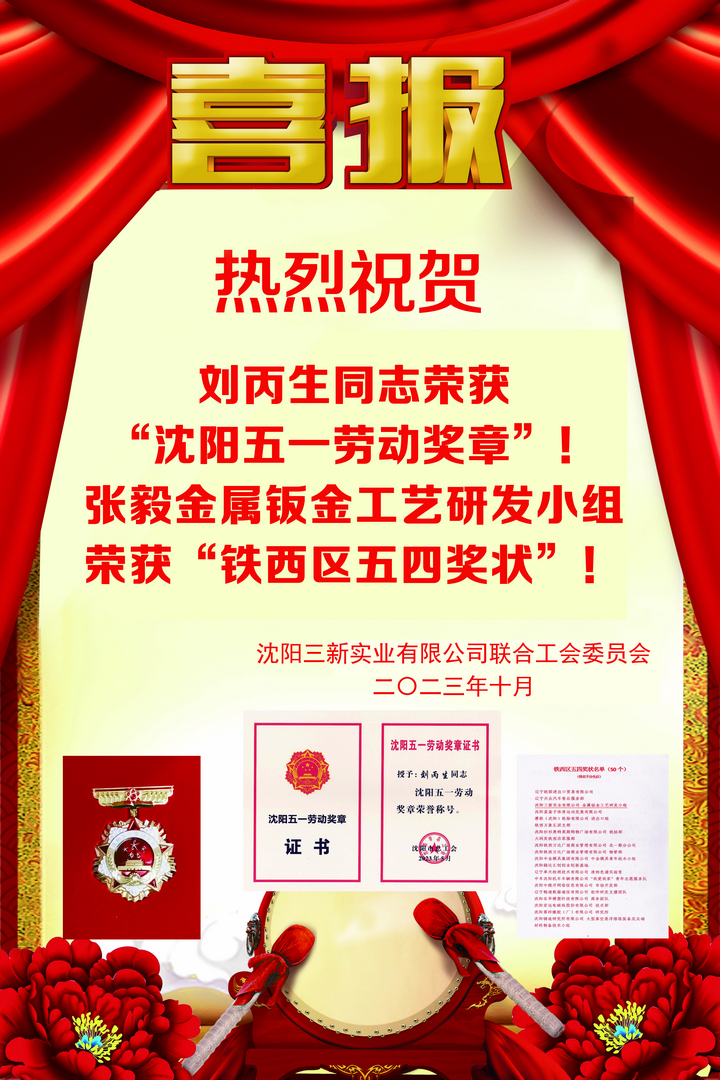 熱烈祝賀 劉丙生同志榮獲“沈陽五一勞動獎章”! 張毅金屬鈑金工藝研發(fā)小組榮獲“鐵西區(qū)五四獎狀”!