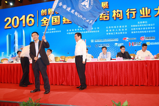 最后,安徽富煌鋼構(gòu)股份有限公司董事長(zhǎng)楊俊斌將象征著年會(huì)承辦權(quán)的會(huì)旗交到2017年的承辦單位沈陽(yáng)三新實(shí)業(yè)有限公司總經(jīng)理洪長(zhǎng)禧手中,我們明年沈陽(yáng)再聚首!